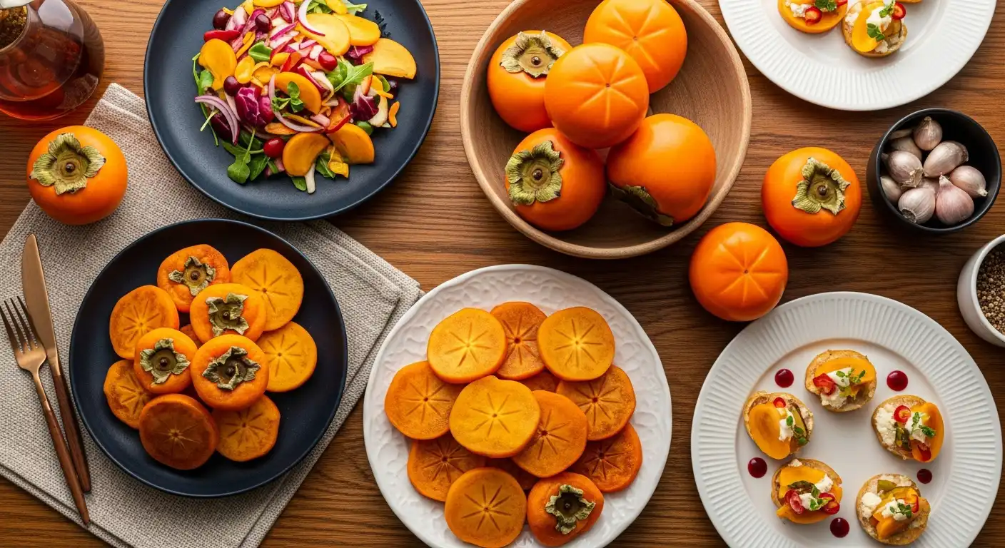 신선한 단감과 단감말랭이, 단감 샐러드 등 다양한 단감 요리가 풍성하게 차려진 가을 식탁 전경